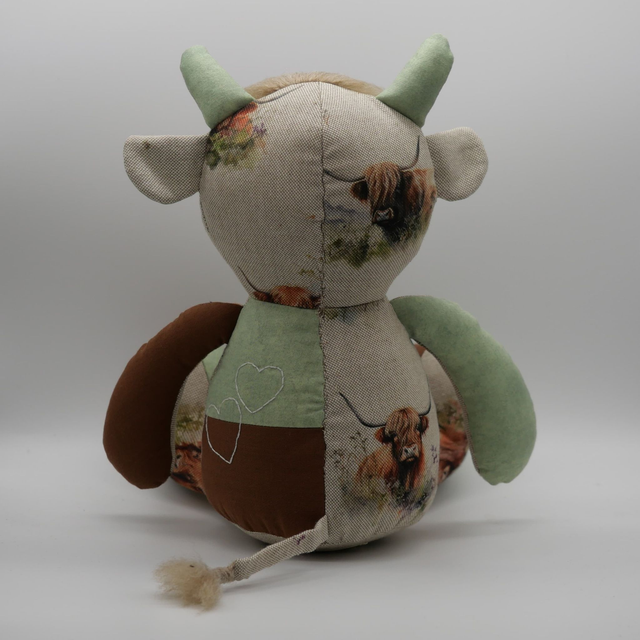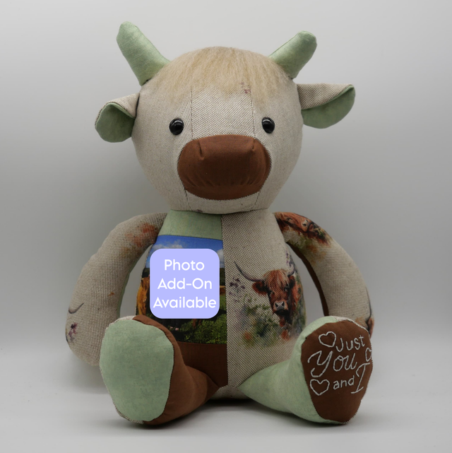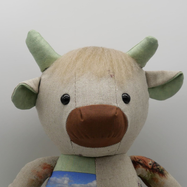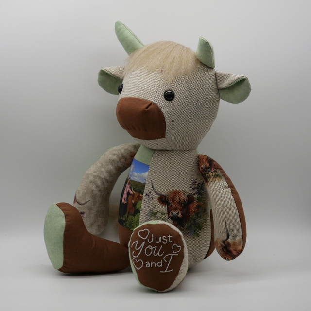 Memory Cow made from a loved one's clothes. Baby clothes, adult's clothes or any special chosen fabrics can be used!