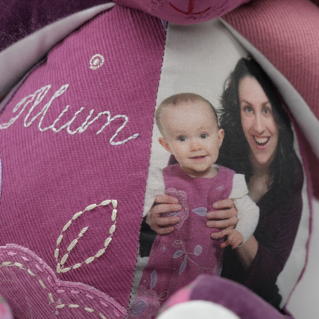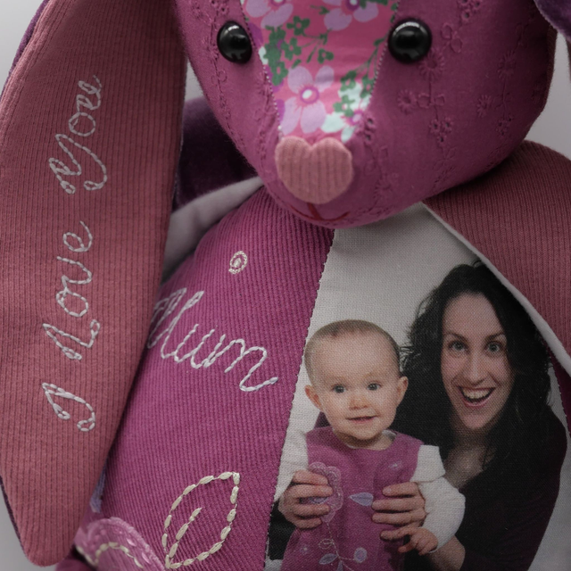 Memory Bear or Bunny made from sentimental fabrics with a photo of your choice on the front. Any special chosen clothes/fabrics can be used!